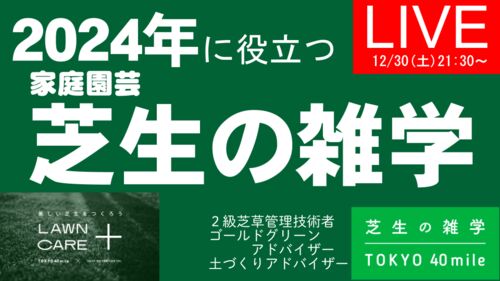 今晩(12月30日)21:30からのライブ配信では「2024年に役立つ家庭園芸芝生の雑学」と題して、芝生手入れの様々な作業の実施時期や方法を考えるためのヒントになる「雑学」のお話をします。 そもそも「芝生の手入れ」って何なんでしょうか?基礎から知りたい…